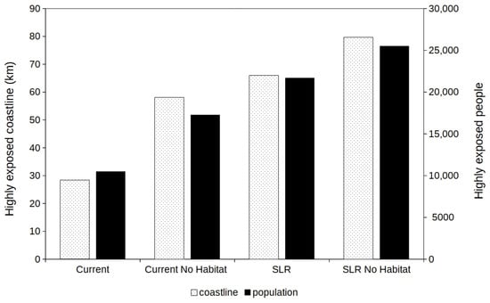 The combined effects of SLR and habitat loss on coastal and population exposure are shown in Figure 6. Ecosystems provide a significant contribution towards coastal protection, with the complete loss of habitats under current sea level conditions causing a 104% and 64% increase in the length of highly exposed coastline and the number highly exposed people, respectively. Yet, SLR appears to be a stronger risk factor, with end-of-century conditions producing a 117% and 89% increase in highly exposed coastline and population assuming the preservation of current habitats extent (Figure 6).