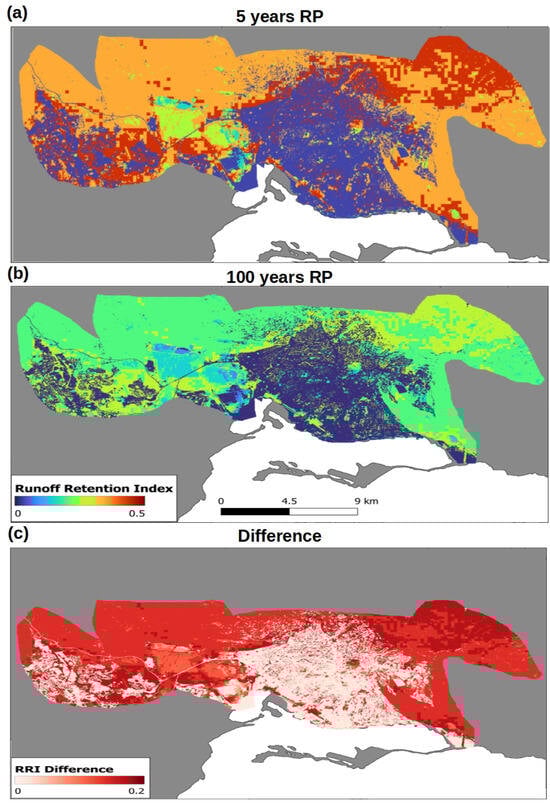 Runoff Retention Index for (a) 5-year RP storm (178 mm rainfall/24 h) and (b) 100-year RP storm (342 mm rainfall/24 h), with the difference between the two scenarios shown in (c).