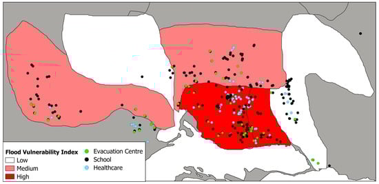 Flood Vulnerability Index of the six studied catchments. Low flood risk (FVI < 2) is shown in white, medium risk (2 < FVI < 3.5) in pink, and high risk (FVI > 3.5) in red. The location of schools (black dots), healthcare facilities (cyan dots), and evacuation centres (green dots) across the six catchments is also highlighted.