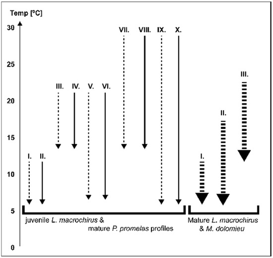 Schematic of thermal profiles (in °C) used in controlled laboratory cold shock experiments of juvenile and mature L. macrochirus, mature P. promelas, and mature M. dolomieu. Dashed arrow lines indicate temperature decline at ~4 °C/h; solid arrow lines decline at ~8 °C/h. Roman numerals indicate trial number.