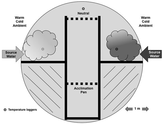 Choice maze experimental design for behavioral experiments with M. dolomieu. Acclimation pen contained the test fish overnight prior to the commencement of the choice trial. 2nd gate was closed as soon as fish had entered the “Neutral” area of the maze. The temperature treatment (warm, cold, or ambient) for each side chamber was determined randomly for each trial. Source water entered the choice maze at the location of the two large arrows; water was drained from the choice maze in the neutral area.