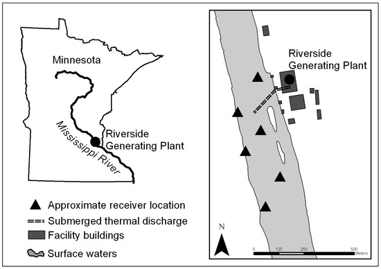 Approximate location of Riverside Generating Plant and the hydroacoustic telemetry array located on the Upper Mississippi River near Minneapolis, MN, USA.