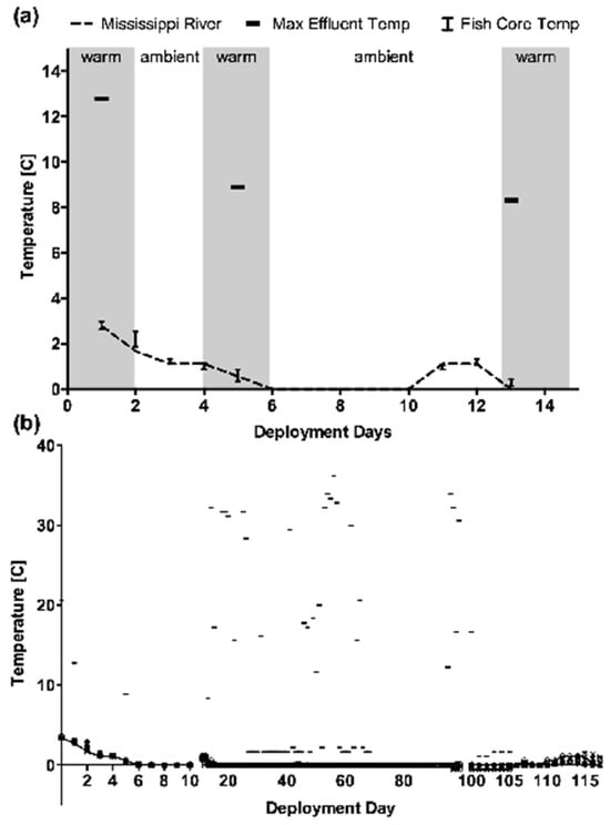 Relationship between water temperature, maximum effluent discharge temperature, and fish core body temperature (mean +/− standard error) in M. dolomieu tracked via telemetry in the vicinity of a thermal effluent in the Mississippi River near Minneapolis, MN over (a) a 14-day period and (b) the entire 115-day deployment period.