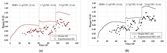Moreover, comparing the curves predicted by the model for both cases, the AD reactor generates higher values for particulate carbon, tCOD, and TKN content (Figure 2a, Figure 4a and Figure 5a, respectively), in comparison with the MEC-AD reactor (Figure 2b, Figure 4b, and Figure 5b, respectively) for all OLRs examined, which is also the case with the experimental values. In addition, the generated values of soluble carbon, sCOD, and soluble nitrogen (Figure 2d, Figure 4d and Figure 5d, respectively) appear slightly increased in the MEC-AD reactor simulation, which is a direct consequence of the increased decomposition of particulate matter and their hydrolysis towards their soluble forms. The results are in accordance with previous studies that have focused on the effect of the applied potential on the enhancement of the hydrolysis step in anaerobic digestion [4,5,15,30]. Furthermore, Figure 6 depicts the predicted biomass concentrations in both reactors, where the simulation predicts that the MEC-AD reactor yields marginally increased cumulative biomass concentrations. This divergence became more apparent at high OLRs and reached a maximum divergence of ~0.4 g/L (Figure 6c).