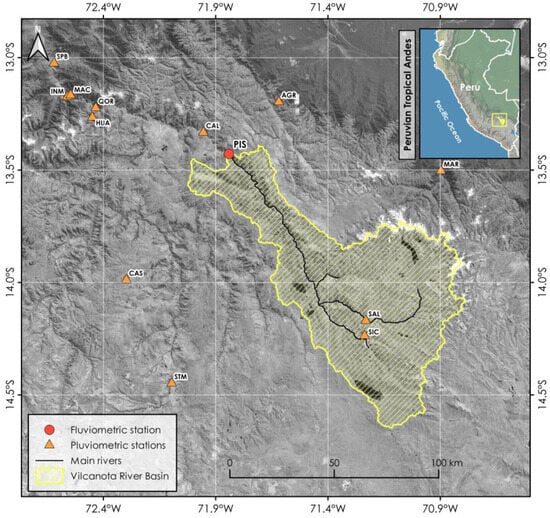 In this context, flood forecasting in the Peruvian Tropical Andes is a challenging task due to (a) the inaccessibility of remote areas with complex topography, (b) a limited in situ hydrometeorological network due to restricted funds, (c) the large number of stations with short records (e.g., most pluviometric automatic records begin in 2016) and huge numbers of missing values, and (d) increased uncertainties of model inputs related to data scarcity. Some studies in the Vilcanota River Basin dealt with these issues by assessing near real-time satellite precipitation products for rainfall–runoff modeling at sub-daily timesteps [43], constraining structural errors in conceptual hydrological models [18], and incorporating vegetation remote sensing into model calibration strategies [44]. Hence, the improvement of accurate flood forecasting in real-time hydrological systems is still a pending task.