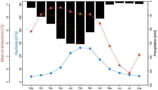 Seasonal variations in rainfall, mean air temperature, and discharge for the climatological period 1981–2010 on the Vilcanota River Basin at the Pisac stream gauge station. Monthly rainfall [45] and air temperature [46] data were obtained from the gridded PISCO dataset.
