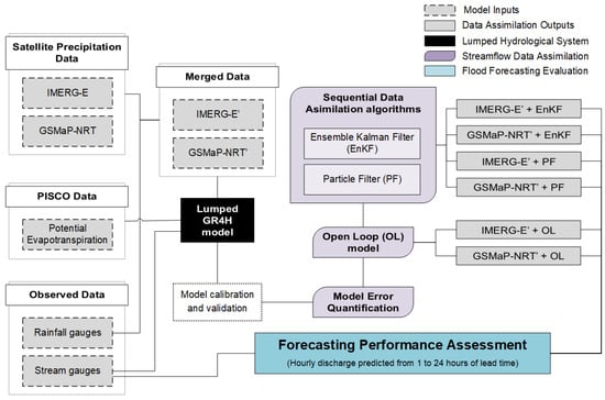 The application of streamflow DA may follow three main steps. In the first place, the design of the DA experiment scheme includes the selection of variables to be perturbed and assimilated. For example, rainfall represents the common variable to be perturbed in ensemble modeling and real-time in situ streamflow measurements are increasingly being used to improve estimations of forecasting models via data assimilation in many operational systems, such as in [22,23,24,25,26]. Next, the quantification of model errors is a key process in DA applications because modeling uncertainties in rainfall, model states, and discharge may have significant impacts on results, even more than the DA algorithm selected [27,28]. Finally, the application of the chosen DA algorithms into an Open Loop (OL) hydrological model. For instance, sequential assimilation of observations in models with the Ensemble Kalman Filter (EnKF) and Particle Filter (PF) is widely employed for probabilistic hydrologic predictions and skillful operational flood forecasting systems, such as in [29,30,31,32].