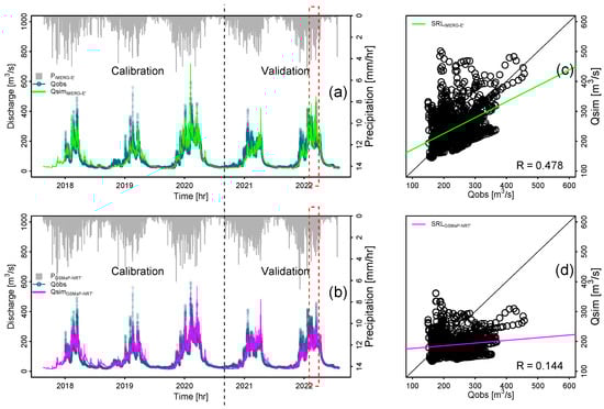 (a,b) Comparison of simulated (IMERG-E’ and GSMaP-NRT’) and observed hourly flow series at the Pisac stream gauge station during 2017–2022. The red dashed box represents the period February–March 2022 selected for testing streamflow DA techniques. (c,d) Scatter plots between observed and simulated discharges for the period February–March 2022.