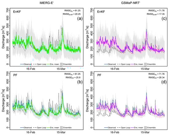 The root mean squared error (RMSE) values in Figure 5 quantified errors between simulated and observed discharges and are displayed to represent the preliminary improvement in simulations after streamflow DA concerning Open Loop (OL) simulations. In OL cases, the obtained lower RMSE values indicated that IMERG-E’ (61.25 m3/s) simulations performed better than GSMaP-NRT’ (71.76 m3/s). This is notable when comparing the observed and OL series. For instance, IMERG-E’ simulations usually overestimated discharge, while for the same period, GSMaP-NRT’ tended to underestimate high flow.