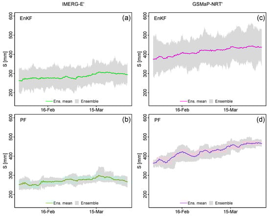 Uncertainty in simulated soil moisture (S) from the GR4H model in the Vilcanota Basin during February and March 2022 for (a) IMERG-E’+EnKF, (b) IMERG-E’+KF, (c) GSMaP-NRT’+EnKF, and (d) GSMaP-NRT’+PF experiments.