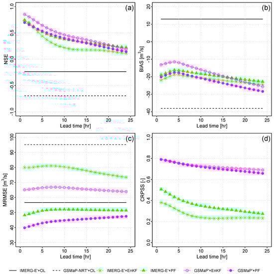 In terms of NSE, Figure 7a shows that the OL forecasting was much worse (NSE < 0), especially for GSMaP-NRT’. Nevertheless, the ensemble means of the GSMaP-NRT’+EnKF setup had the best performance after streamflow assimilation, with NSE values always higher than those of other schemes. For instance, considering a threshold value of 0.50 for acceptable forecasting, the GSMaP-NRT’+EnKF exhibited acceptable predictions during the first 8 h, while the remaining schemes exceeded this threshold in only the first 5 h.