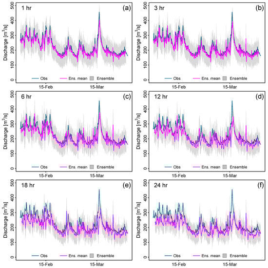 Figure 8 displays the comparison between observed (blue lines) and forecasted (magenta lines) hydrographs with GSMaP-NRT’+EnKF for lead times of 1, 3, 6, 12, 18, and 24 h. In addition, ensemble spreads from an ensemble size of 100 members are shown as gray bounds. A quick examination of the hourly hydrographs illustrates the low quality of long-term forecasts (e.g., 18–24 h). For example, the peak flow values during the middle of March 2022 for lead times of 18 h (328 m3/s) and 24 h (302 m3/s) hugely subestimated the observed value (465 m3/s). In contrast, high peak flow forecasts given by the most recent prediction (e.g., 1–6 h) were considered to be the best estimate, as shown in Figure 8a–c. Nevertheless, the ensemble means forecasted discharges were still below the observed values, but at much less magnitude than the OL runs and during model calibration-validation.