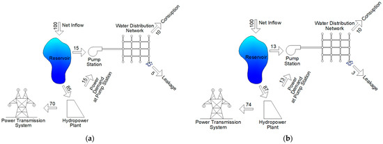 Theoretical example of the water–energy nexus in a reservoir: (a) high leakage; (b) low leakage.
