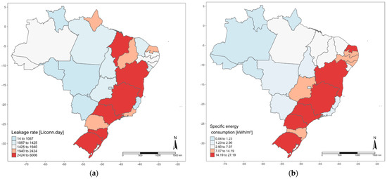 To estimate the direct energy lost due to leakages in water distribution systems, the database provided by the Sanitation Information System (SNIS) was used [25]. Two indicators were collected for the years 2007–2021: (i) leakage rate by connection (Equation (1)) and (ii) specific energy consumption (Equation (2)). Figure 2 shows an overview of these two indicators for 2021. In general, the worst results for the leakage rate are observed in states with higher demographic concentration, especially in the south and southeast regions. The same is observed for the specific energy consumption, which can be explained by the increased demand and topography of these regions, requiring more pumping stations to attend to the consumers. However, it is also important to highlight that the data obtained from SNIS are provided by the water companies and, therefore, are subject to high uncertainty. In addition to these indicators, the value of the total connections was also collected. Thus, the total volume of water lost through leakages is calculated by Equation (3), and the corresponding energy wasted is calculated by Equation (4).