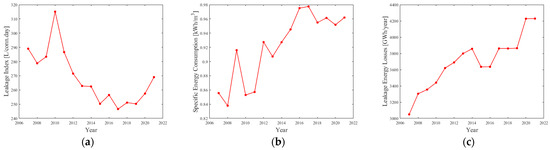 Historical evolution of indicators in Brazil: (a) leakage rate; (b) specific energy consumption; and (c) energy wasted due to leakages.