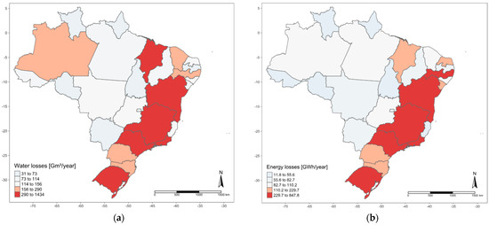 Overview of the losses due to leakages in water supply in Brazil: (a) water; (b) energy.