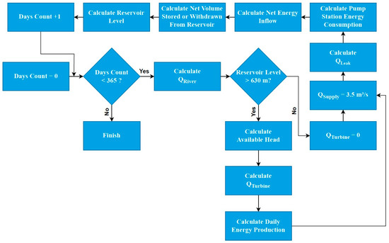 Considering that the water supply is the priority for the reservoir operation and that the pumping station requires a minimum level of 630 m, the net energy production and the net volume of the reservoir can be calculated daily during a year of operation. The flowchart presented in Figure 6 summarizes the system modeling with the operational restrictions described.