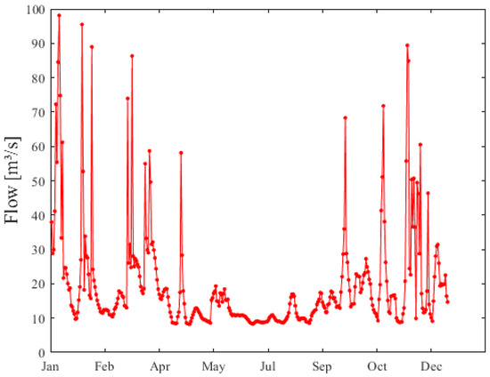 The long-term natural inflow of the reservoir from 1959 to 2011 [28] is shown in Figure 7. The term “natural flow” refers to the hypothetical flow observed in a section if there were no human interventions upstream [29]. In order to represent the seasonality better, the data were separated by month. For each monthly dataset, the fit of probability distributions Weibull, log-normal, and Gamma were compared, as suggested by [30], for modeling flows. To analyze the quality of the probabilistic models, the Bayesian Information Criterion was estimated, as shown in Table 1. It may be inferred that the log-normal distribution is best fitted to the data.