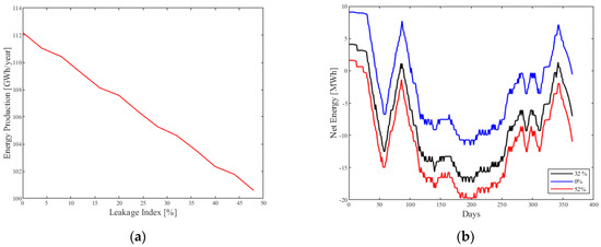 Leakage impact in hydropower operation: (a) energy reduction for different leakage rates; (b) net energy in a year for original, minimum, and maximum leakage rates.