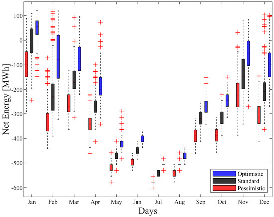 Using the forecasted natural flow of the river for five years of operation, Figure 9 shows the monthly net energy of the system for three different climate change scenarios. It can be observed that during the dry season, the net energy has a lower variation, as the natural flow is more constant due to the lack of rain. Consequently, the net energy is severely affected, requiring an additional 500 MWh per month from external power plants to attend to the energy consumption of the pumping station, as the energy produced by the existing hydropower plant of the system is not sufficient. During the rainy season, the river flow variability is higher, and therefore, the net energy is also more variable. Despite the increase in available power, energy production can be limited by the turbine’s capacity and the reservoir storage capacity. For the case study, these problems were not significant for the net energy of the system, i.e., the spilled flow is low. However, comparing the three scenarios during the rainy season, it is clear that in a pessimistic scenario of climate change, in addition to the water resources scarcity, the energy available is also severely affected. Finally, comparing the climate change impact with the leakage impact, it is clear that the lack of water resources is potentially more harmful to the system, as it drastically reduces the hydropower plant availability.