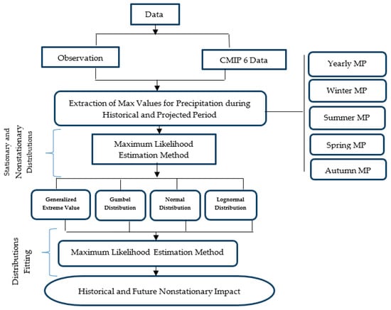 Both stationary and nonstationary probability distributions are applied to estimate the effects of nonstationarities. Precipitation analyses incorporate the GEV, Gumbel, normal, and lognormal distributions. Global Circulation Models (GCMs) have been utilized for future forecast periods, while historical analysis has been performed using observed data. Figure 2 provides an explanatory flowchart for the approach used in this study.