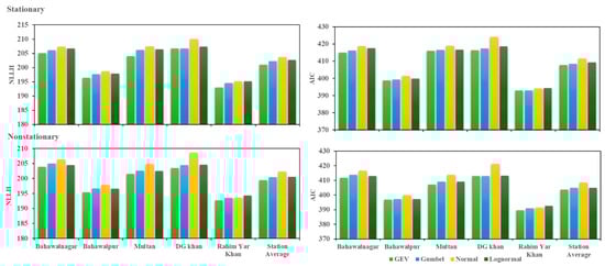 Comparison of NLLH (left) and AIC (right) values of probability distributions for annual maximum precipitation of historical data under stationary and nonstationary assumptions.