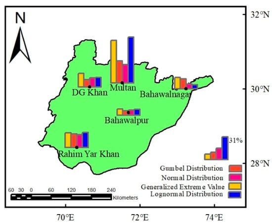 During spring, similar nonstationarity impacts have been observed for four probability distributions. There are certain consistent trends in impact types across all stations. Except for GEV, the results show that the three probability distributions have a negative impact on Rahim Yar Khan. All other stations, on the other hand, exhibit a positive impact. The results suggest that adopting GEV has a positive impact (10% to 50%) across all stations. Positive impacts are found with all other probability distributions (6% to 98%) across all stations except Rahim Yar Khan, where negative impacts (9% to 15%) were identified with the three previously mentioned probability distributions.