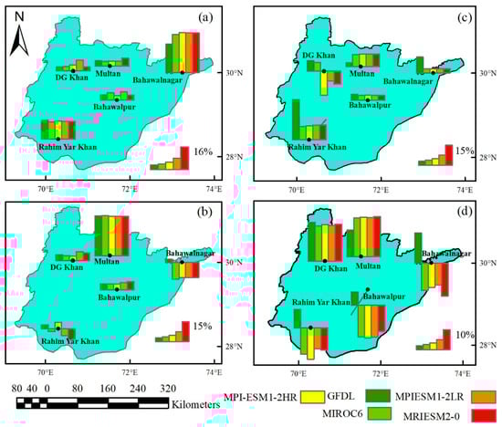 Table 4 depicts the projected nonstationary impacts (%) for 100-year return levels generated by the GEV distribution at a seasonal scale. During winter, all the projected model shows higher positive nonstationary impacts in Bahawalpur, Rahim Yar Khan, as compared to the other three stations during the ssp2 (2020–2060). The negative nonstationary impacts (up to 6%) were observed in the DG-Khan and Bahawalpur for all the projected models except MPI-ESM1-2hr, MPI-ESM1-2lr, and MRIESM1-0, which show little positive nonstationary impacts. The Positive nonstationary impacts (up to 35%) have been identified for all projected models in Bahawalpur, Bahawalnagar, and DG-Khan during the spring at ssp2 (2020–2060). Except for MPI-ESM1-2HR, MPI-ESM1-2LR, and Mriesm1-0, two of the three forecast models indicated lower extreme precipitation in Multan and Rahim Yar Khan. Positive nonstationary impacts (up to 15%) have been observed in Bahawalpur and DG-Khan during the ssp5 (2020–2060). All of the forecast models revealed positive (up to 4%) and negative (up to 10%) nonstationary impacts at the remaining three stations. Positive nonstationary impacts (up to 35%) have been found for all forecast models across all stations in the ssp2 (2020–2060). During the ssp5 (2020–2060), all stations had positive nonstationary impacts (up to 20%) for all projected models, with the exception of the DG-Khan station, which had two of the five projected models have negative nonstationary impacts (up to 5%). Positive nonstationary impacts were observed throughout all the stations (up to 25%) for all the projected models in the SSP2 (2020–2060). Higher nonstationary return levels (positive nonstationary impacts) of extreme precipitation were found across all stations for the five projected models in the SSP5 (2020–2060), with the exception of Bahawalpur, where one of the five projected models represent positive nonstationary impacts (up to 8%), and the remaining models form negative nonstationary impacts (up to 5%).