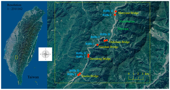 Sampling for this study was conducted in 2021, in the upper-middle section of the Nanzihsian Stream, a tributary of the Kaoping River in southern Taiwan. The Nanzihsian Stream is about 117 km long and 20–50 m wide (water surface), with a watershed area of about 741 square kilometers. The highest elevation in the watershed is 3750 m, its lowest point is 50 m, and the average slope of the stream bed is 1:15 [20]. The unaltered annual mean flow is 30 m3/s, as measured at the Nan-Feng Bridge hydrologic station (Water Resources Agency, Ministry of Economic Affairs, 2009). Streams in the sampling area meander through open valley floors without shade from woody riparian vegetation [13] (Figure 1).