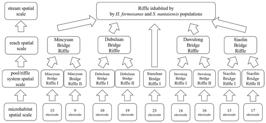 As mentioned above, we sampled fish from the riffle systems located both upstream and downstream of a deep pool, which we designated the pool/riffle system spatial scale. Next, we considered both the upstream and the downstream riffle systems together, which we designated the reach spatial scale. The sampling sites at the Mincyuan, Dubuluan, Dawulong, and Siaolin Bridges all had two types of riffle systems, named Riffle I and Riffle II, but there was only one type of riffle system at the Sianshan Bridge sampling sites. In summary, there were 9 riffle systems at the pool/riffle system spatial scale and 4 riffles (combining Riffles I and II) at the reach spatial scale. In addition, we identified the stream spatial scale as encompassing all the sampling sites. Finally, the PAED electrode was designated the microhabitat spatial scale (Figure 2).