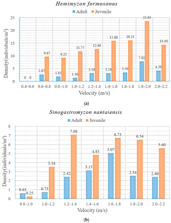 Density of juveniles and adults at different flow velocities for (a) Hemimyzon formosanus and (b) Sinogastromyzon nantaiensis.