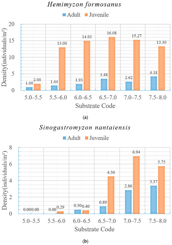 Density of juveniles and adults at different substrate codes for (a) Hemimyzon formosanus and (b) Sinogastromyzon nantaiensis.
