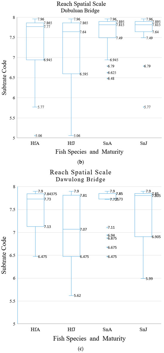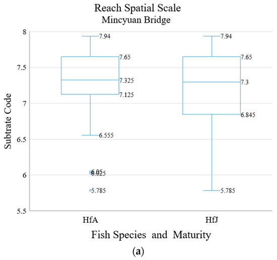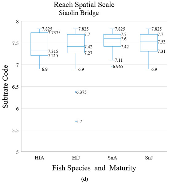 At the reach spatial scale, we repeated the analysis that was performed on the data collected at the riffle system spatial scale (see Figure 6a–d, Table 6 and Table 7). At the reach scale, the analysis of intraspecific and interspecific habitat differences was not performed because there was only one riffle at the Sianshan Bridge.