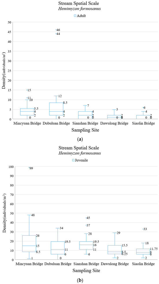 The density of H. formosanus adults was found to be statistically significantly higher than that of S. nantaiensis adults in the stretch of river from the Mincyuan Bridge to the Dubuluan Bridge (p-value = 0.000 at the Mincyuan Bridge and 0.010 at the Dubuluan Bridge). However, the opposite was true from the Sianshan Bridge to the Dawulong Bridge, where S. nantaiensis adults were denser, with a statistically significant difference at the Siaolin Bridge (p-value = 0.041). Between the Mincyuan and Siaolin Bridges, the densities of adults of both species reached their peaks which were staggered, with H. formosanus found near the Dubuluan Bridge and S. nantaiensis more numerous near the Sianshan Bridge. The density of S. nantaiensis adults is significantly higher than that of H. formosanus adults at the Sianshan Bridge (p-value = 0.050); the density of S. nantaiensis adults is significantly lower than that of H. formosanus adults at the Dubuluan Bridge (p-value = 0.010). The distributions of the density of juvenile fish of these species show opposite tendencies from sections farther upstream moving downstream, with S. nantaiensis following a rising trend line and H. formosanus following a decreasing trend line. S. nantaiensis juveniles reached their highest density at the Siaolin Bridge, which coincidentally is where the H. formosanus reached their lowest density. The density of S. nantaiensis juveniles is significantly lower than that of H. formosanus juveniles at the relatively upstream Mincyuan Bridge and Dubuluan Bridge (p-value = 0.000 at the Mincyuan Bridge and Dubuluan Bridge). The peak density of fish of each species at the same developmental stage was observed at different sampling sites, which suggests that there was a difference in interspecific distribution structure between these species at the stream spatial scale.