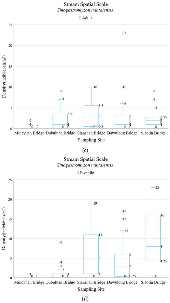 Differences in distribution structure along the longitudinal gradient of the Nanzihsian Stream for: (a) adults of Hemimyzon formosanus; (b) juveniles of Hemimyzon formosanus; (c) adults of Sinogastromyzon nantaiensis; (d) juveniles of Sinogastromyzon nantaiensis.