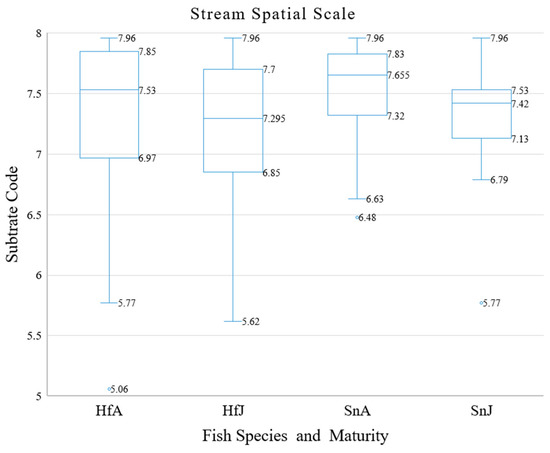 The results of the analysis of differences in the interspecific and intraspecific distribution structure of the two fish species at the stream spatial scale are shown in Table 9 and Figure 7a–d. In addition, using a statistical analysis t-test and the big data of 155 electric grids, which contained 494 adults and 2220 juveniles of H. formosanus and 296 adults and 625 juveniles of S. nantaiensis, and we confirmed the differences in both interspecific and intraspecific habitat use of the two benthic fish species at the stream spatial scale. In terms of interspecific habitat preference comparisons, adults of the H. formosanus prefer habitats with significantly faster flow velocity than juveniles of S. nantaiensis(p value = 0.034), and in terms of intraspecific habitat preference comparisons, adults of H. formosanus prefer habitats with significantly larger substrate particle size than juveniles (p value = 0.000). The substrate particle size of the preferred habitat of S. nantaiensis adults was the largest significantly (p value = 0.000, vs. by the latter), followed by juveniles of S. nantaiensis, adults of H. formosanus, and juveniles of H. formosanus that were the smallest significantly (p value = 0.000, vs. by the former) (See Figure 8). The flow velocity of the preferred habitat of adults of H. formosanus was the fastest, followed by adults of S. nantaiensis, juveniles of S. nantaiensis (p value = 0.010, vs. by the former), and juveniles of H. formosanus was the slowest significantly (p value = 0.010, vs. by the former). We again confirmed that the interspecific and intraspecific habitat use of the two benthic fish species was different at the stream spatial scale.
