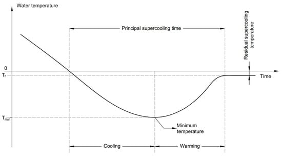 The formation of frazil ice involves the development of small crystalline particles resulting from the supercooling of water and the presence of turbulence. This natural phenomenon is commonly observed in both river and ocean environments [8] In the context of freshwater systems, such as northern rivers, individual frazil ice particles are transported by turbulent flow and undergo collision events. Through these collisions and the cohesive properties of the ice, the particles agglomerate, forming clusters known as frazil flocs. This process is referred to as flocculation [9]. The production mechanism of frazil ice follows a consistent pattern, which can be illustrated by a typical test curve depicted in Figure 1 (e.g., [4,10,11,12,13]). Furthermore, a vital notion is worth considering—it is important to note that this relationship holds true only in the absence of snowfall.