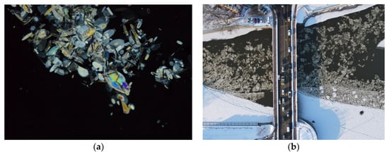 (a) Raw digital image showing frazil particles and flocs for freshwater; source: [9]. (b) Frazil ice floe in Odra river on 12 February 2021, with a different object of observation (Wrocław, Poland).