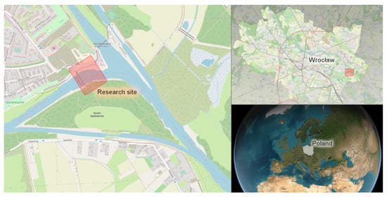 The investigation was conducted on 12 February 2021 at the Opatowice weir, situated at km 245 + 035 along the course of the Odra River in Wrocław, Poland (Figure 3). This weir is part of the Bartoszowice-Opatowice barrage, which comprises two weirs and two locks. The Bartoszowice-Opatowice barrage plays a significant role in the canalized Odra River, serving three primary functions: (1) maintaining controlled water levels for navigation purposes, (2) stabilizing soil and water conditions for agricultural and forestry activities, and (3) regulating the riverbed. Within this barrage, the Bartoszowice weir and the Opatowice weir enable the division of water flow into the City Odra River and the Flood Canal, while also supplying water to the Bartoszowice-Zacisze Navigation Canal.