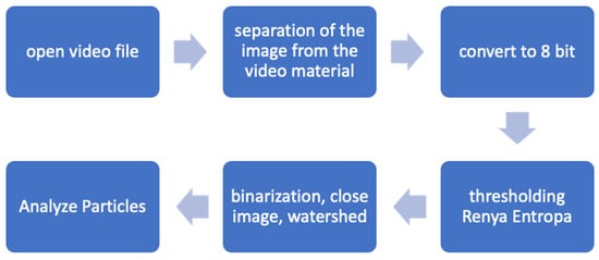 The presented work is an extension of the methodology presented in previous work [1], where we utilized the open-source Fiji (version 1.53t) in conjunction with the TrackMare plugin [43] to assess the flow velocity of frazil ice floes. This approach enabled us to generate moving trajectories, calculate distances covered and determine preference indices in two-choice assays. The analysis was extended to include ice morphometry, i.e., shape detection and identification, surface area, perimeter, circularity. In the study, the open-source Fiji version 1.53t [44] was employed which is costless, multiplatform and under an open license. It is widely used in image analysis. It has options for importing ready-made scripts. To determine the selected morphometrical parameters of the ice, a stabilized UAV video recording was used. To extract frames from the recording, images from 0.5 s, 1.5 s, 2 s, 2.5 s, 3 s, 3.5 s, 4 s, 4.5 s, 5 s, 5.5 s, 6 s, 6.4 s were recorded for a total of 12 images. The files were then saved in the lossless tiff format. The 12 images prepared in this way were transformed to an 8-bit gray-scale. The batch files that were prepared in this way were subjected to a thresholding process that allows for the selection of bright fragments—in this case, a flowing floe against the background of dark, unfrozen water. This process can be performed manually for each frame. To avoid an arbitrary selection being made by the operator, the Renya Entropa [45] algorithm was used. Thanks to this, the same thresholding conditions were achieved for all batch files. The results of the Renya Entropa algorithm are binary files (black and white). In order to eliminate minor errors, the close option was used—adding one pixel (dilation) from the perimeter of the floe and then subtracting (erosion) one pixel [46]. The files were converted to grayscale and then to 8 bits. The closure function smoothes objects and fills small holes (less than 26.83 cm2), which may be the result of noise generated by camera matrices. The watershed function was used to automatically separate or cut apart particles in contact (e.g., aggregated ice fields). This is a fast and flexible algorithm for computing watersheds in digital gray-scale images. The algorithm is based on an immersion process analogy, in which the flooding of the water in the picture is efficiently simulated using a queue of pixels. This is commonly used in applications like medical image analysis, geospatial image processing, and object recognition, where the precise segmentation of objects in images is crucial [47]. All measurements were performed automatically. Subsequently, the processed images were analyzed using the ‘Analyse Particles’ function, which computed the ice area, perimeter, and circularity using the formula 4𝜋 (area/perimeter2). A circularity value of 1.0 indicates a perfect circle, while a value approaching 0.0 signifies an increasingly elongated polygon. Images that extended beyond the defined reading area were excluded from the analysis. The workflow diagram applied in this study is depicted in Figure 4.