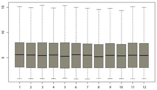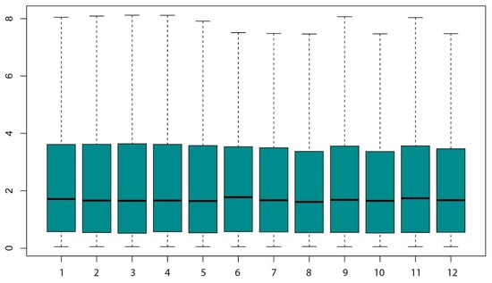 The fundamental morphometrical parameters were described using standard statistical measures, including minimum, maximum, first and third quartiles, median, and mean. The examination of individual frames within the recording demonstrated the method’s high efficacy, with results exhibiting only minor deviations from the average. Figure 6, Figure 7 and Figure 8 illustrate boxplots depicting the morphometrical characteristics of frazil ice floes, specifically surface area, perimeter, and circularity. These visuals affirm the method’s robustness and consistency in parameter readings.
