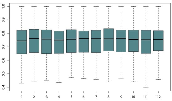 Boxplots of circularity (dimensionless) of drifting ice, divided into individual film frames (outliers removed).