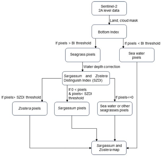 Song, S.; Sakuno, Y. Method for Distinguishing Sargassum and Zostera in the Seto Inland Sea Using Sentinel-2 Data. Water 2023, 15, 3979. https://doi.org/10.3390/w15223979