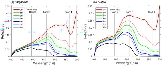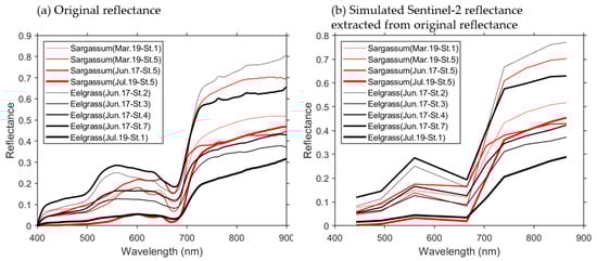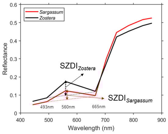 - The spectral reflectance characteristics of Sargassum and Zostera measured on site were understood. In general, the characteristics exhibit low reflectance in the blue and red bands for both Sargassum and Zostera, but exhibit relative high reflectance in the green band for Zostera.