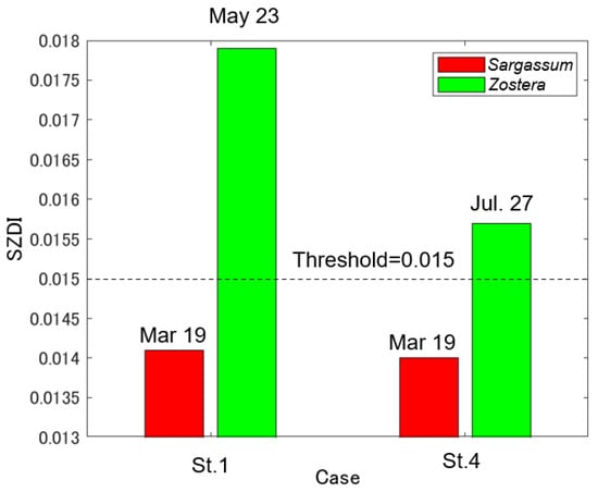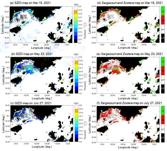 - The SZDI, which used the height from the background of Sentinel-2 Band 3 (560 nm) as an index, was proposed as a method for separating Sargassum and Zostera. Its validity was confirmed through field surveys, the examination of past SWSG bed maps, and the consideration of biological characteristics.