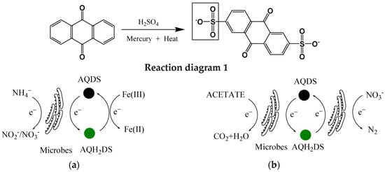 In addition to natural quinone mediators, there are also many artificially synthesized quinones, including 9,10-anthraquinone-2-carboxylic acid, anthraquinone-2,6-disulfonate (AQDS), anthraquinone-2-sulfonate (AQS), etc. Therein, AQDS and AQS are the most studied artificially synthesized quinone compounds. Both AQDS and AQS can be prepared via a chemical synthesis method: reacting anthraquinone (a natural raw material) first with sulfuric acid in the presence of mercury and then with sodium hydroxide (Reaction diagram 1). They were reported to play similar roles; however, their catalytic performance and mechanism during the electron transfer process vary greatly depending on their molecular structures and polarities, as well as the presence of different microorganisms and pollutants [7,18,25]. AQS is suggested to be a more powerful mediator than AQDS. This is because the redox potential of AQS is lower than that of AQDS. Moreover, the additional sulfonate group of AQDS diminishes the ease with which the compound approaches the functional enzyme. In addition, the roles of these artificially synthesized quinones change as reaction conditions change. For example, Zhou et al. [26] demonstrated that AQDS could first act as an electron acceptor during the anammox denitrification process in the presence of iron-reducing bacteria; then, the reduced AQDS can chemically react with Fe(III) (Figure 2a). In addition, for microbes, AQDS can simultaneously be used as an electron donor and an electron acceptor (Figure 2b). Wang et al. [27] reported that AQDS can enhance the coupled biotransformation of phenol and nitrate: AQDS is first reduced to AQH2DS (electron acceptor) by Shewanella sp. XB in the presence of phenol, and then AQH2DS (electron donor) provides electrons to strain XB for its further bioreduction of nitrate. On the whole, artificially synthesized quinone compounds are more targeted and efficient than humic substances.