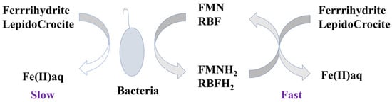 - Shi, Z.; Zachara, J.M.; Shi, L.; Wang, Z.; Moore, D.A.; Kennedy, D.W.; Fredrickson, J.K. Redox reactions of reduced flavin mononucleotide (FMN), riboflavin (RBF), and anthraquinone-2, 6-disulfonate (AQDS) with ferrihydrite and lepidocrocite. Environ. Sci. Technol. 2012, 46, 11644–11652. [Google Scholar] [CrossRef]