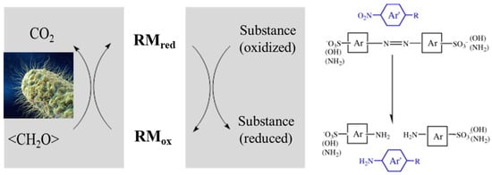 The proposed biotransformation process of QRM-mediated azo dyes and nitroaromatics. RMred, reduced redox mediator; RMox, oxidized redox mediator [49].