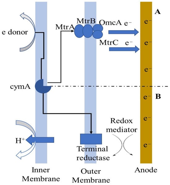 The proposed electron transfer pathways from microbes to the electrode [21]. (A) Mtr pathway; (B) terminal reductase.