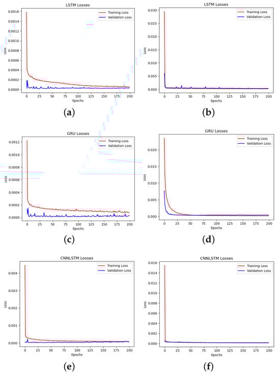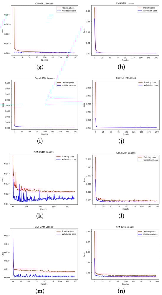 Performance of the LSTM, GRU, CNNLSTM, CNNGRU, ConvLSTM, STA-LSTM, and STA-GRU models during training and validation error. (a,c,e,g,i,k,m) Before lag time; (b,d,f,h,j,l,n) After lag time.